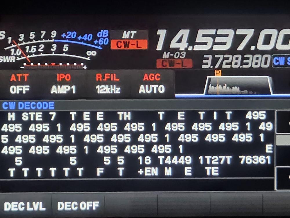 Please see the attached pics - the captured decode of the CW is from a Yaesu FTDX-10. Included is an M4A sound file, which is 7 minutes of what hearing it was like.