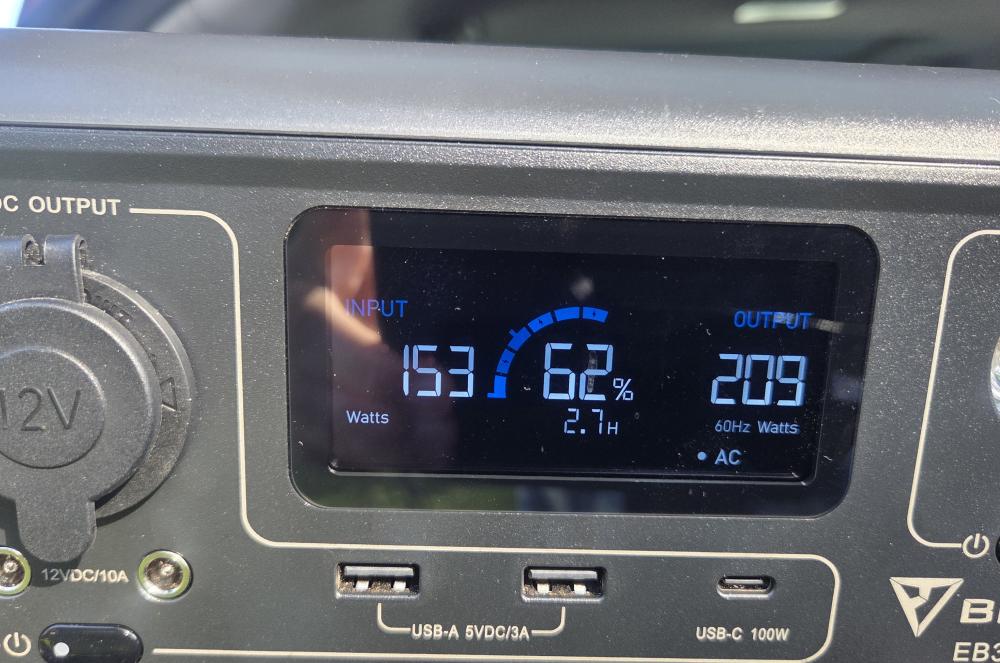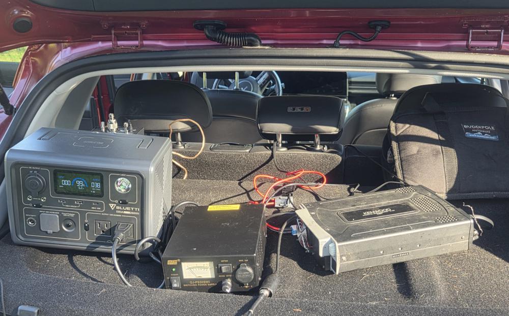 It was also a test for Bluetti batteries, used remotely - so that 100 watts got out the antenna. Main battery is Bluetti EB3A 268Wh battery with inverter, pics show the draw for 100 watts power at radio. The estimate is that the EB3A would give an hour of radio time at that power, so the Bluetti B80 expansion battery (806.4 Wh) was pressed into service to continually top up the EB3A. The pair would allow up to four hours of 100 watts transmission.....