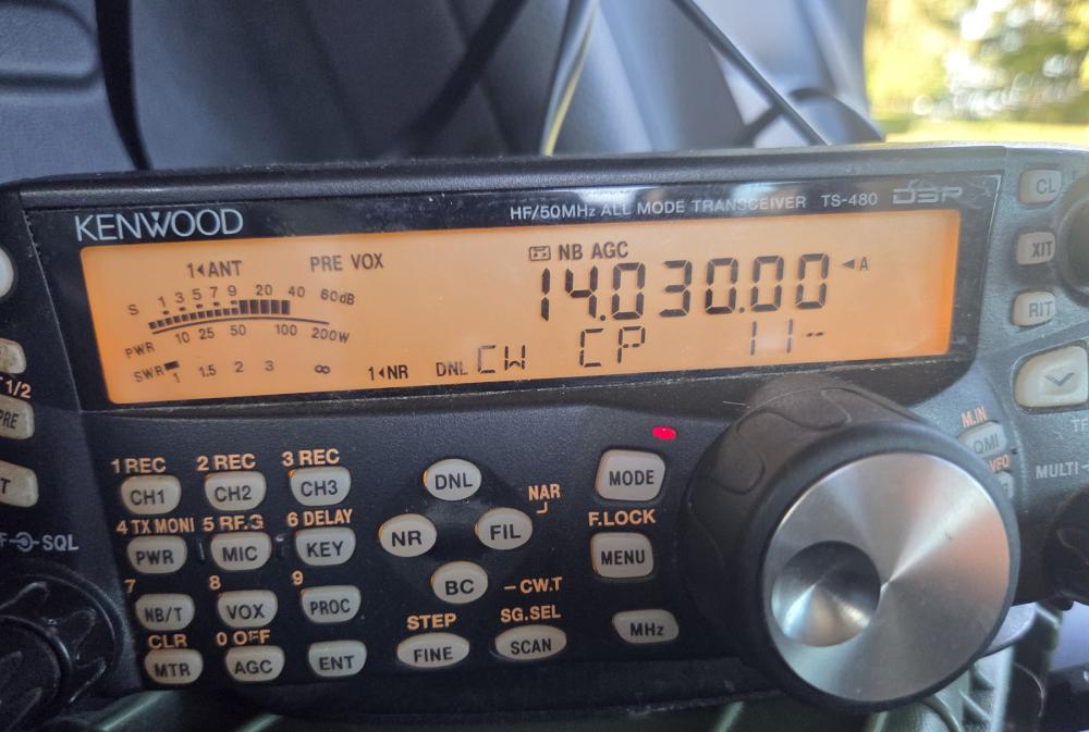 A mild success, although the farthest DX was Russia! Note the pics, Kenwood 480SAT with no tuner, Ralph had been very helpful in tuning the Buddipole/stick to near 1:1 SWR on all bands. Stu worked 20 metres, 17 metres and 15 metres, with near 1:1 SWR, by adding/subtracting antenna arms supplied by Buddistick, as well as varying the length of the 10' whip. Of course, critical was the correct length of the counterpoise.