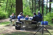 Club members met together in a grassy section of Ruth Johnston Park which still has all the large evergreens standing throughout it. This area is to the south -west of the main buildings in the park. Jim arrived early and was able to launch his G5RV high into the tall evergreens. The location enabled him to get his antenna to a decent height and he was able to work many stations across the U.S. Meanwhile other members were busy setting up a Buddy Pole on 20m and also a Crank IR vertical antenna system. Comparisons were made between the signal strength between the Buddy pole and Crank IR. The pole seemed to be about 2S units stronger in this setting. Fortunately both were quite quiet and contacts were made QRP on both antennas. Bill brought his home-built 2m Yagi and tried some contacts with this using his hand-held. Bill didn't have much luck reaching other stations with the antenna which led us to wonder about its SWR. Don had his graphing analyzer with him for tuning the Crank IR which gave us the tools to test the yagi. It was found to be a bit low in resonance and so Bill plans to do some more tuning on the driven element later in the week.