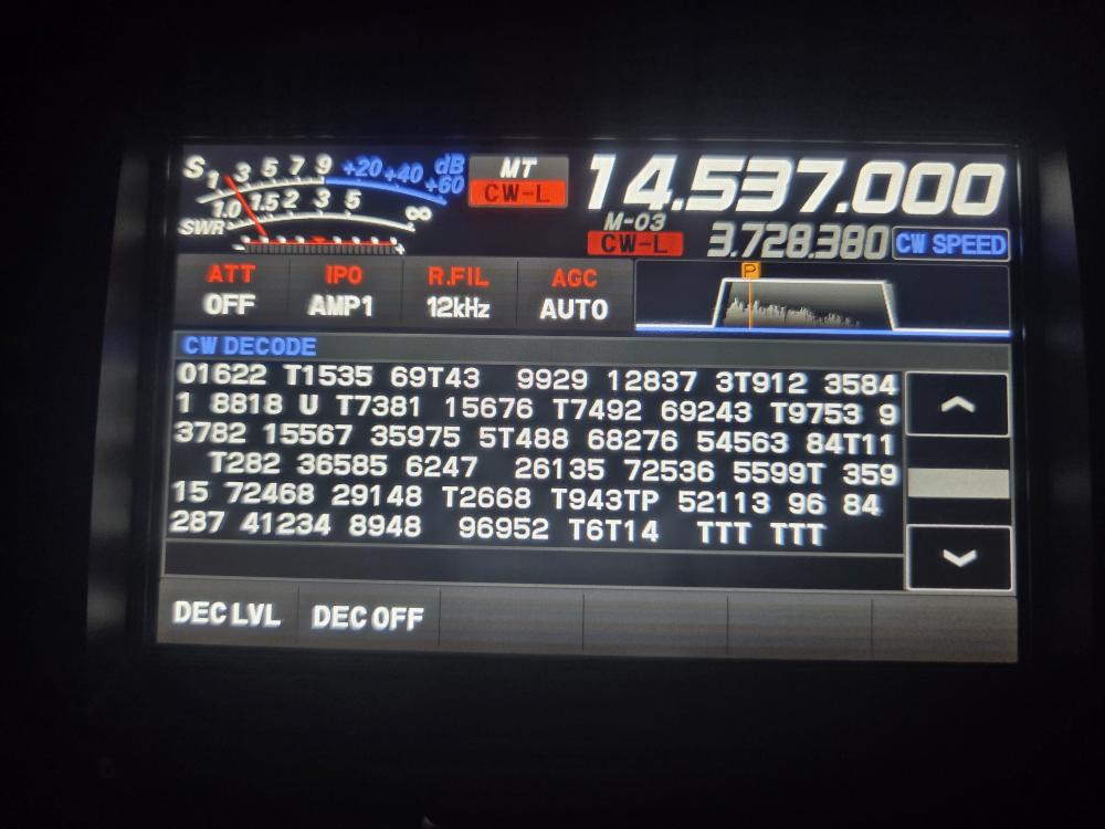 Then the message itself is delivered at a rapid 24/25 WPM. For me, that was a tough read. 'T' means zero, saving on the time CW takes to put out an actual 'zero'. Then the whole thing ends with 'TTT', three zeros, repeated just in case it had been missed.
